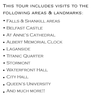 Belfast has a long and often turbulent history. With the help of local historians we have organised a tour which takes you through landmarks that are part of the intriguing history of Belfast. From a great industrial city to the civil unrest which has often tarnished Belfast’s image. This tour reflects the beauty and pride of a city that still has a lot to offer the visitor.
