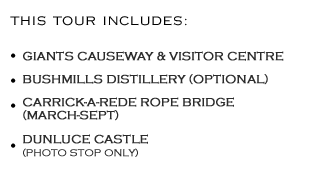 Travel along the coastal route and marvel at the breathtaking scenery of the North Antrim Coast and the green Glens of Antrim. Discover the legend of Finn McCool and gasp at the rock formation unique to the Causeway. See the amazing steps, the organ and on a clear day, even Scotland from this most majestic vantage point.